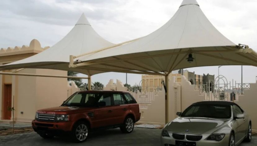 Conical double pole shade Dubai, car parking shade UAE, outdoor tensile structure, double pole canopy, custom shade installation, UV-resistant shade, Al Hussain Tents, parking shelter Dubai.