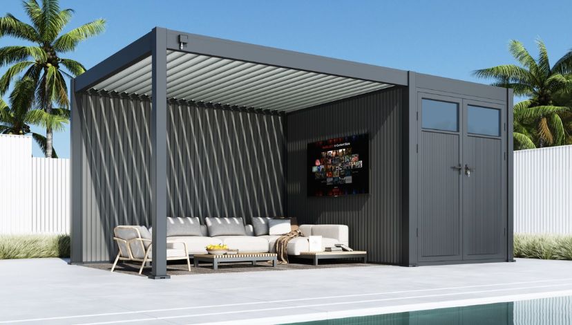 Pergola shed Dubai, outdoor pergola structure, garden pergola UAE, weather-resistant pergola, aluminum pergola shed, custom pergola Dubai, Al Hussain Tents.