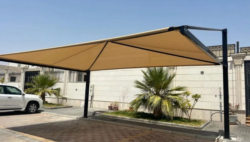 Pyramid arch shade Dubai, tensile fabric shade UAE, pyramid car parking shade, outdoor canopy structure, school shade solution, Al Hussain Tents, custom shade Dubai.